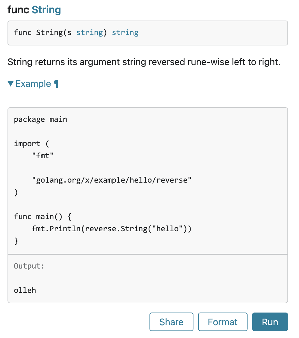 Following this convention, godoc displays the ExampleString example