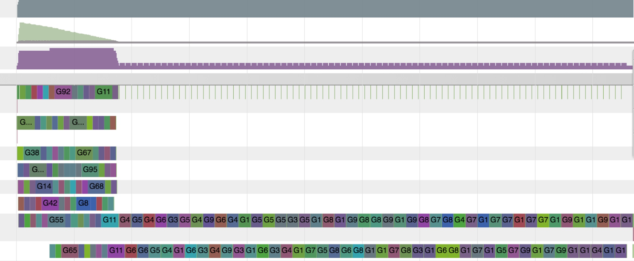 Above, the go tool trace visualization shows the execution started fine, and then it became serialized. It suggests that there might be lock contention for a shared resource that creates a bottleneck.